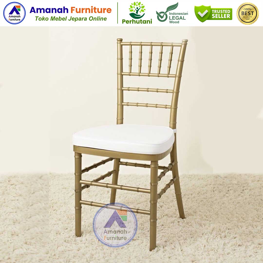 Kursi tiffany warna emas atau kursi tiffany warna putih, kursi tiffany warna silver, kursi tiffany warna coklat salak dan varian warna lainya bisa Anda custom warna sesuai permintaan. Dilengkapi dengan bantalan kursi tiffany yang empuk dan tidak mudah kempes karena menggunakan busa berkualitas.